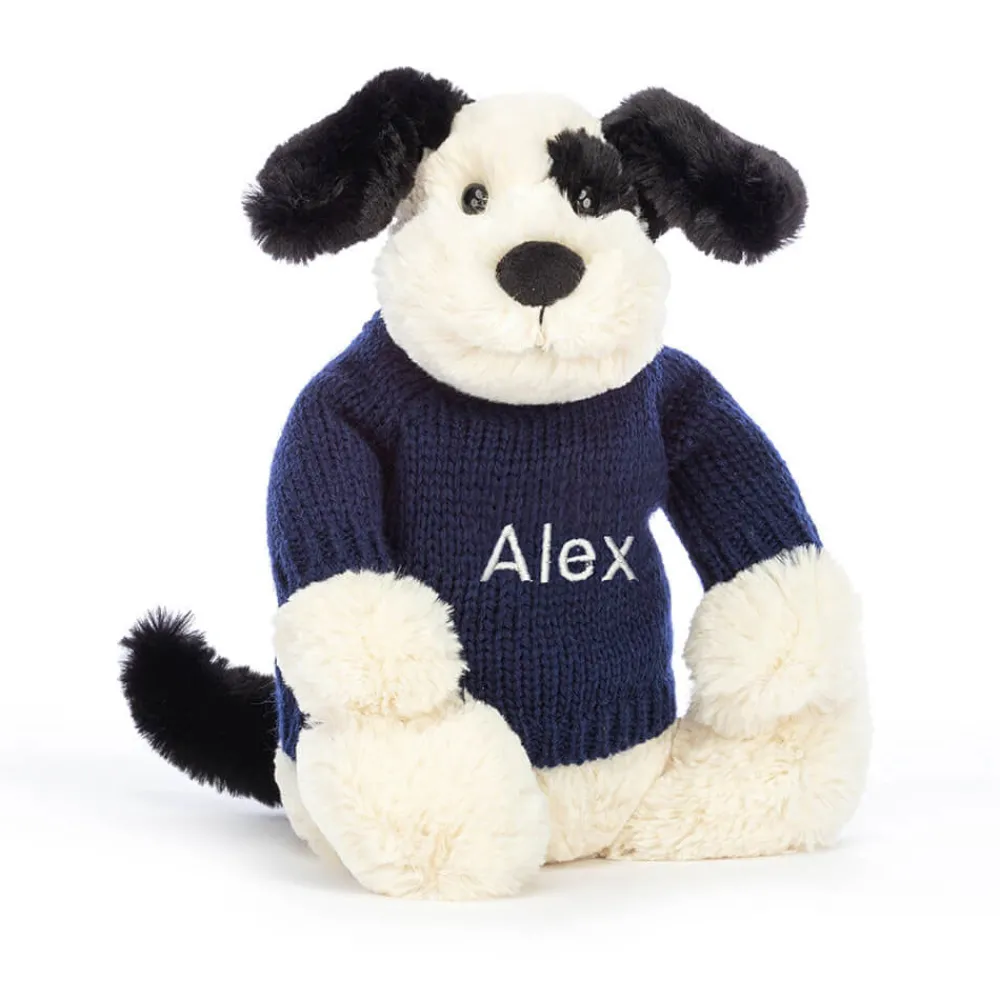 Jellycat Bashful Black & Cream Puppy with Personalised Navy Jumper