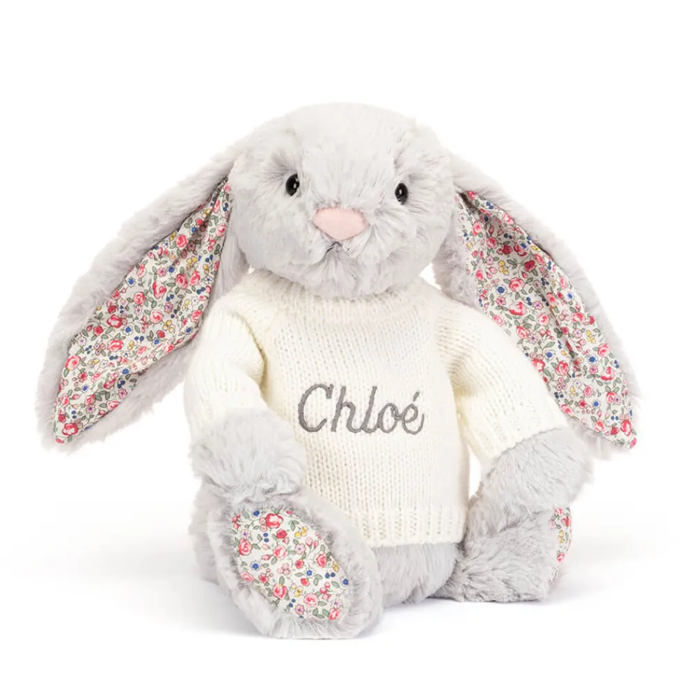 Jellycat Blossom Silver Bunny with Personalised Cream Jumper